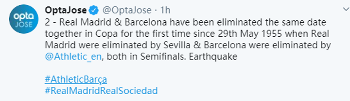 According to Opta Stats, the last time the two Spanish traditional powers were bounced from the competition on the same day was May 29th, 1955, when Real Madrid lost to Sevilla and Barcelona were eliminated by Athletic Club in the semifinals.