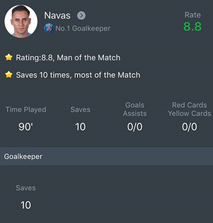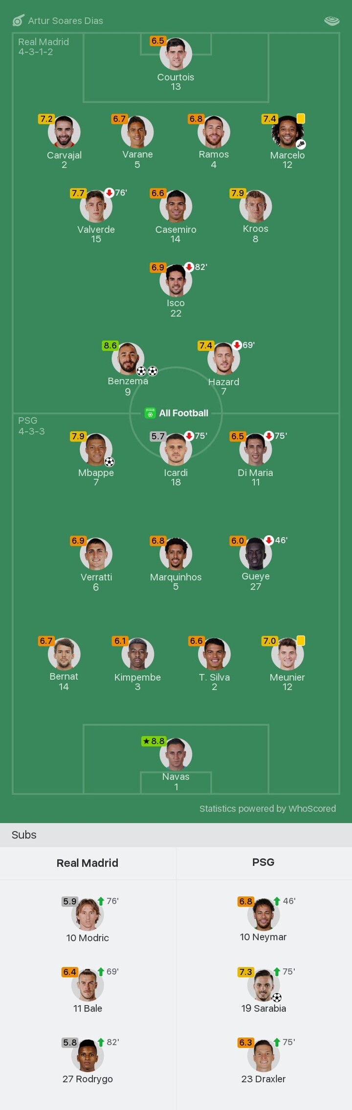 We bring you the player ratings for Real Madrid 2-2 PSG as Navas becomes Man of the Match with a rating of 8.8 after making 10 saves. Benzema gets 8.6