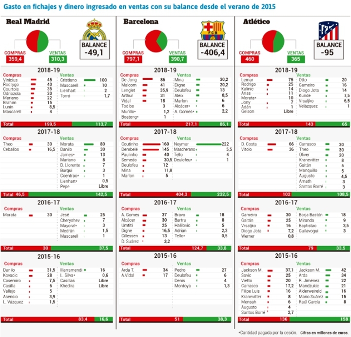 Since 2015, Barcelona have spent €437 million more on transfer than Real Madrid and Atlético have spent €100 million more in order to save money for Bernabéu remodelling.
