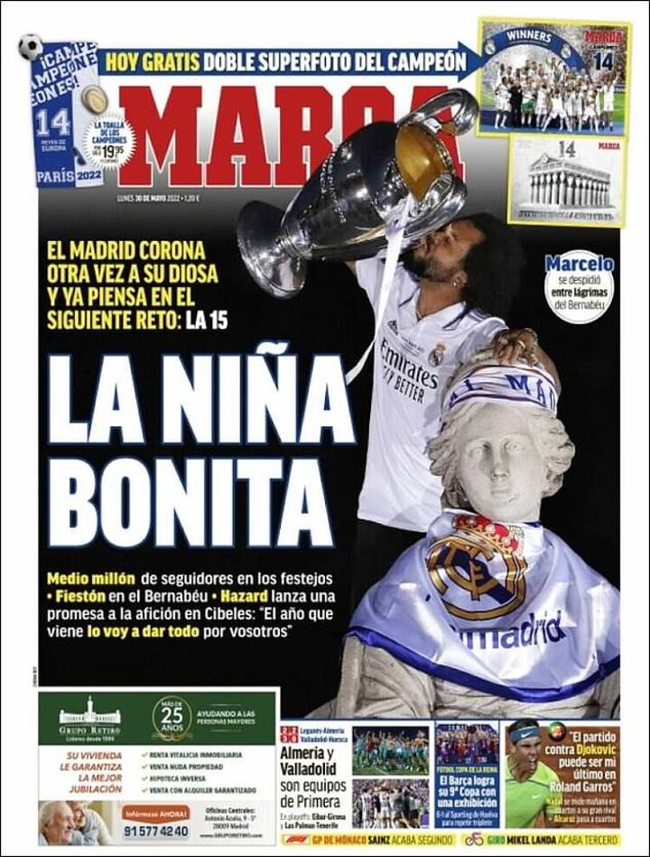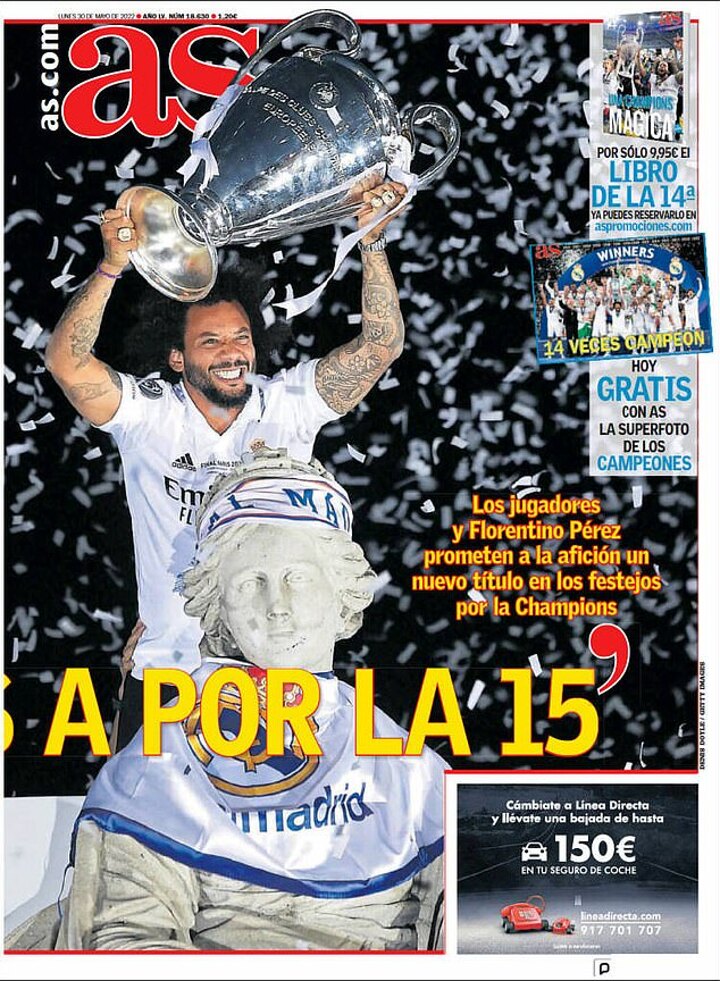 AS led with 'now to the fifteenth' after Los Blancos secured a 14th Champions League win (no other club has more than seven), while Marca's front page read 'the beautiful girl', a Spanish nickname for the number 15.