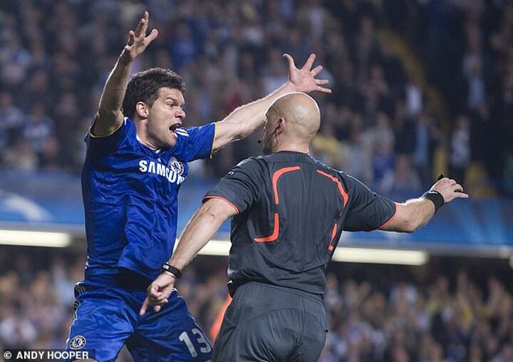 He was later dismissed for a soft foul on Nicolas Anelka in the second half, which was followed by two clear handball shouts; the first saw Gerard Pique palm the ball away as Anelka sought to go past him, and the second came after Iniesta's equaliser, when Michael Ballack's goal-bound shot was blocked by Samuel Eto'o's arm.