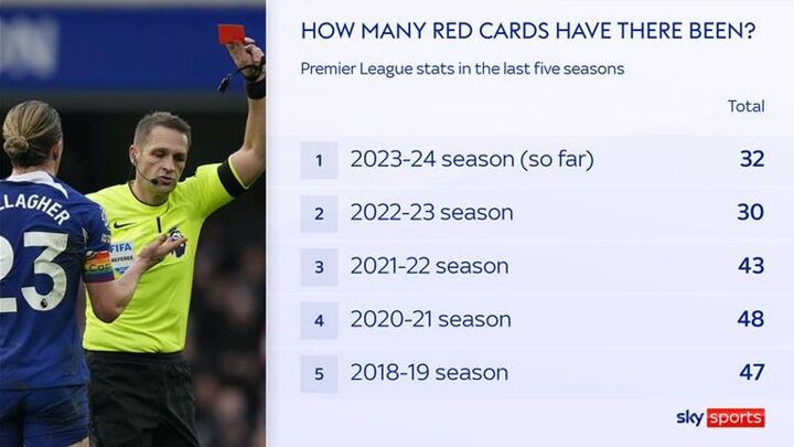Every single Premier League team has picked up at least one red card this season - six went without one in the whole of last term. VAR has upgraded five tackles to red cards and downgraded none this season - VAR upgraded six and downgraded three throughout the entire of last term.