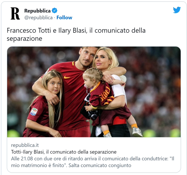 It is the end of a fairy-tale union that for 20 years ran parallel with Italian football and popular culture, as Francesco Totti’s marriage to TV presenter Ilary Blasi is over.