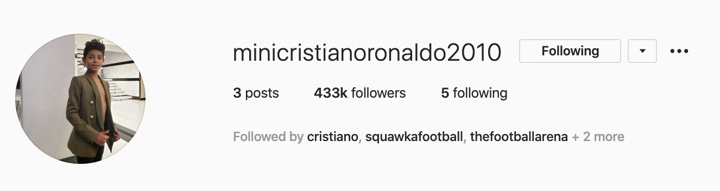 He names himself 'minicristianoronaldo2010' on his first-ever public social network account and has already attracted more than 400 thousand fans