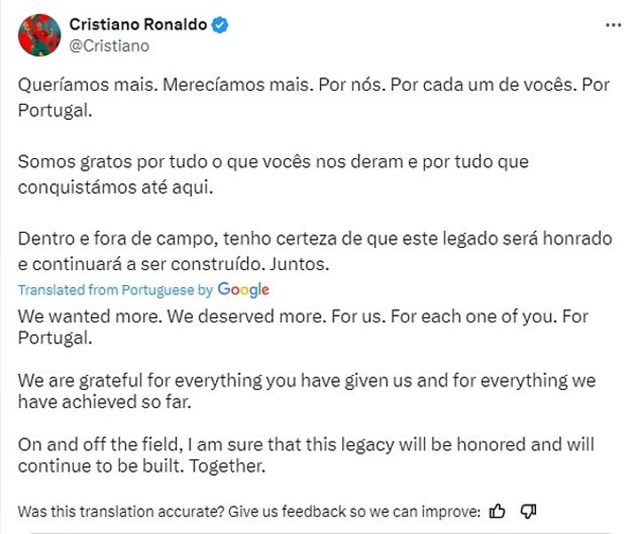 Ronaldo, who was seen comforting his team-mate and Portugal stalwart, Pepe, 41, at the end of Friday night's defeat, has today issued a statement on X (formerly Twitter) claiming that his side 'deserved more.'