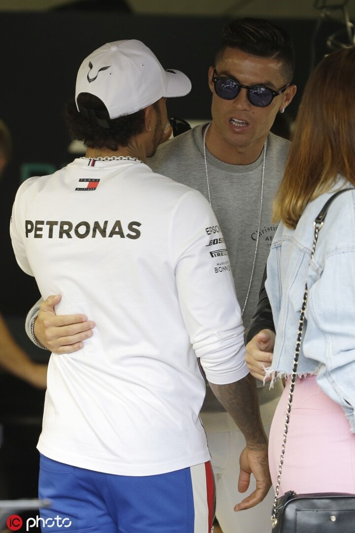 Cristiano Ronaldo has travelled to Monaco to take in Thursday's practice session for the F1 Grand Prix this weekend, where he met fellow sporting great Lewis Hamilton.