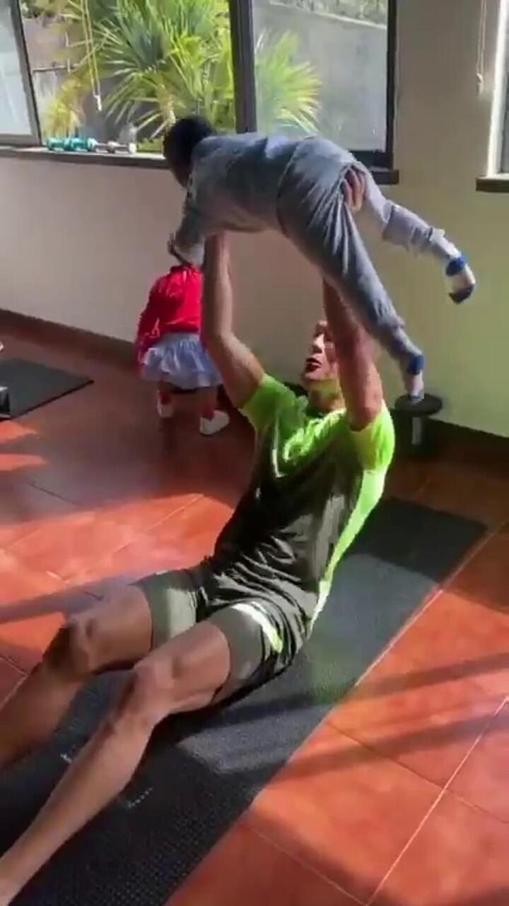 This amuses his children who take turns to be hoisted up in the air by Ronaldo who looked happy that he could finish his work-out.