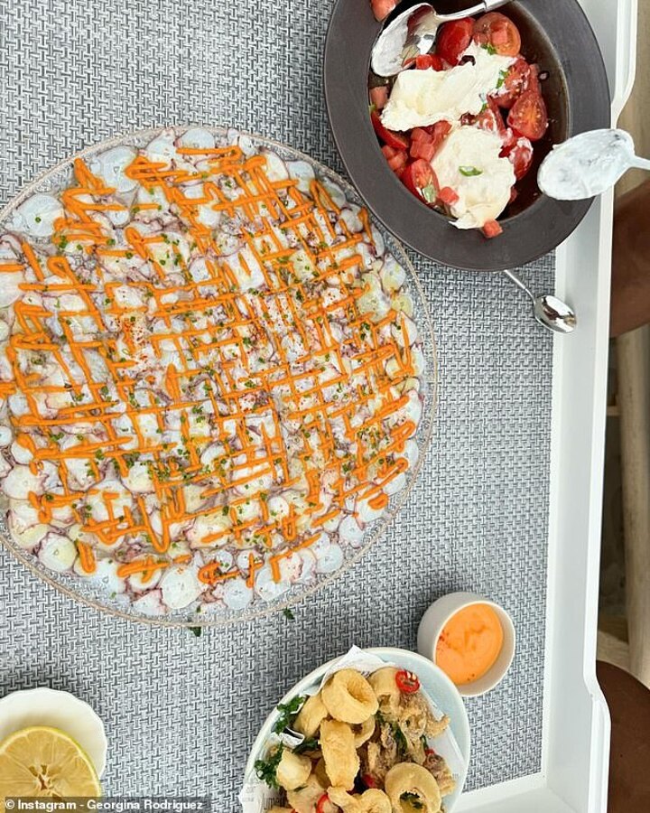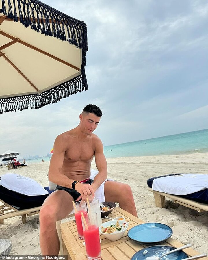 Her post was captioned: 'Two days for two', and in one shot Ronaldo was snapped enjoying some food and drinks while relaxing on a sun lounger, with his ripped physique on show.