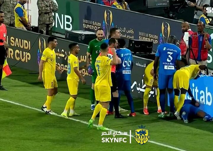 The incident sparked a brawl between the two Saudi rival teams, with former Chelsea defender Kalidou Koulibaly rushing to the aid of his team-mate before being pushed, with Al-Nassr and former Man City defender Aymeric Laporte trying to act as peacemaker in the dramatic late scenes.