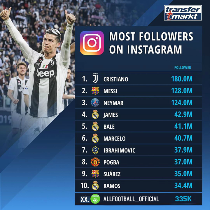 Ronaldo is the footballer who owns the most instagram followers as Messi ranks 2nd. Here comes the top 10 list and our allfootball_official instagram account waits for you to click here and follow!