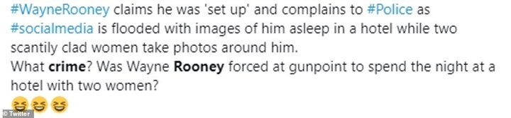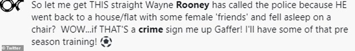 It comes after Rooney fans seemed bemused he had taken the incident in such poor spirit and questioned what offence he thought had been committed. One said: 'What crime? Was Wayne Rooney forced at gunpoint to spend the night at a hotel with two women.'