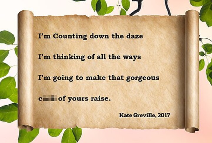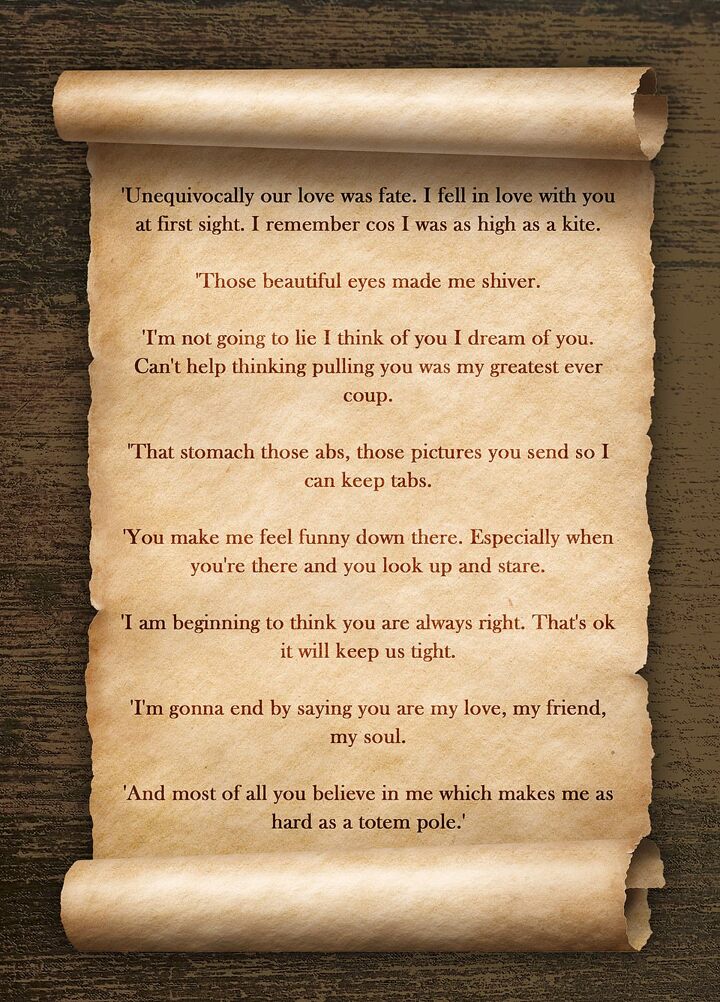 It was sent in response to another poem sent by Miss Greville, in which she wrote: 'You make my heart flutter because you are a nutter. Every day you do me proud not just because you are well endowed.'