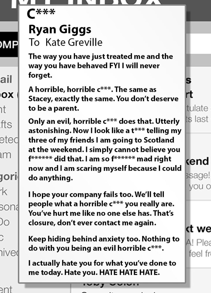 Giggs was accused of bombarding her with abusive and sometimes foul-mouthed messages; threatening to send emails to her employers about their sex life; throwing her out of their home and hotel rooms when she questioned him about relationships with other women and 'stalking' her when they split by turning up at her work, home and gym to win back her affections.