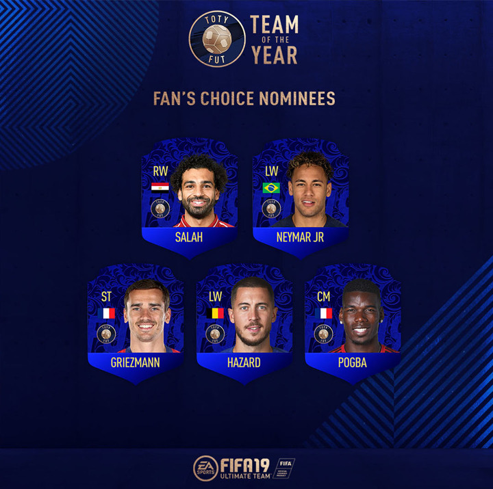Those five candidates are Liverpool sensation Mohamed Salah, Paris Saint-Germain star Neymar, Atletico Madrid forward Antoine Griezmann, Chelsea attacker Eden Hazard and Manchester United midfielder Paul Pogba.