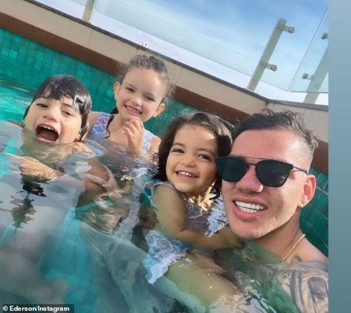 Man City rival Ederson put up a story of him relaxing in a pool with his three children.