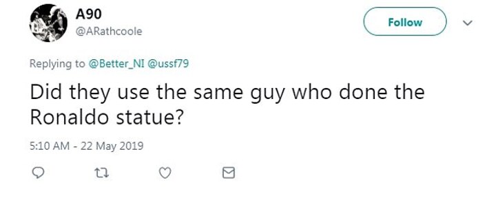 @ARathcoole tweeted: 'Did they use the same guy who done the Ronaldo statue?'.