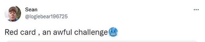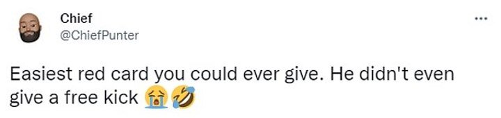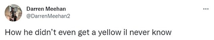 'How he didn’t even get a yellow il [sic] never know,' wrote @DarrenMeehan2 on Twitter, while another user, @ChiefPunter, said: 'Easiest red card you could ever give. He didn't even give a free kick.'