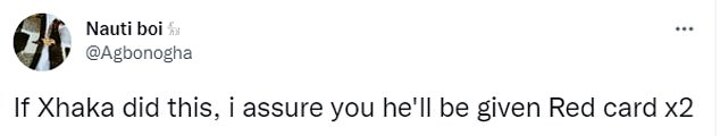 @Agbonogha added: 'If Xhaka did this, I assure you he'll be given red card x2', with @logiebear 196725 describing it as an 'awful challenge'.