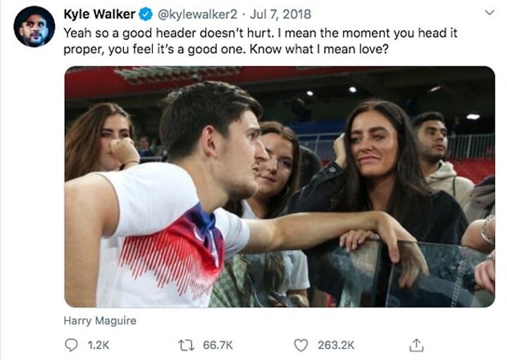 Alongside the picture, Walker wrote: 'Yeah so a good header doesn't hurt. I mean the moment you head it proper, you feel it's a good one. Know what I mean love?'