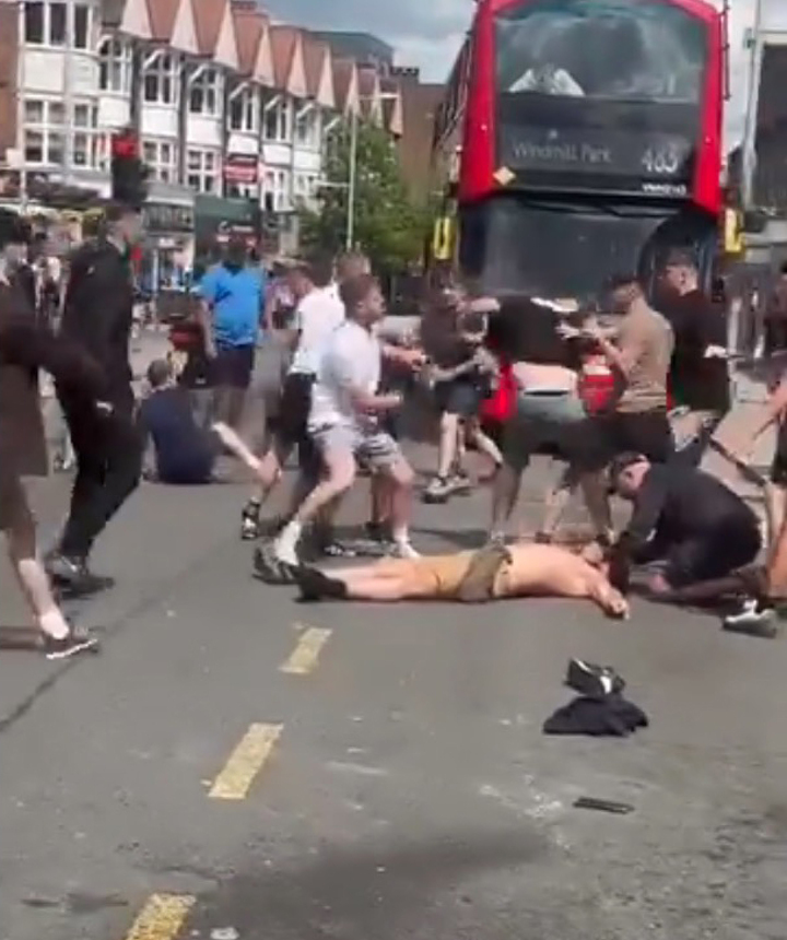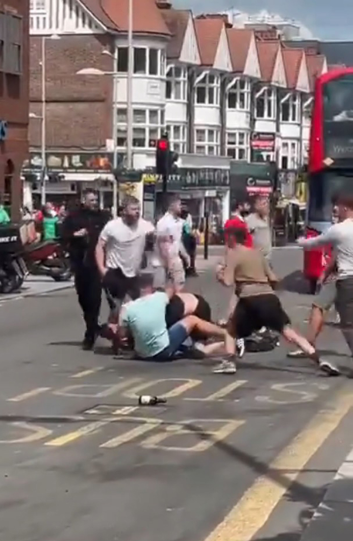 Footage shows the men fighting for about a minute as two red London double-decker buses wait for the chaos to clear.