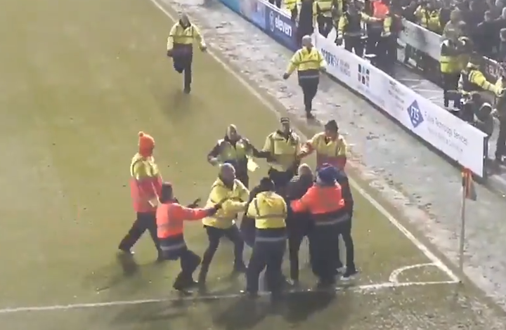 As the three scrapped on the edge of the pitch, stewards finally managed to pull them apart.