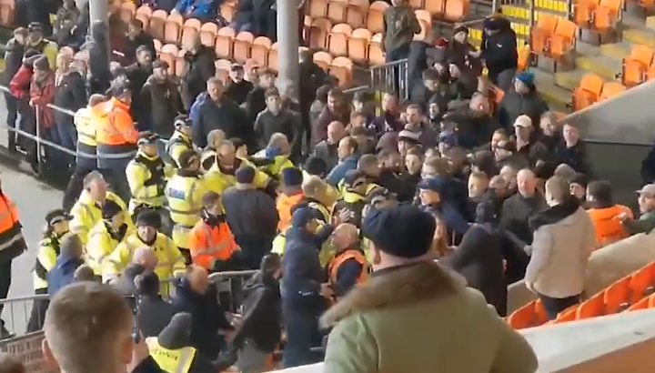 Shocking scenes unfolded in Northwest England yesterday as rival Blackpool and Fleetwood fans fought on the pitch.