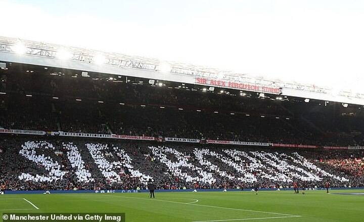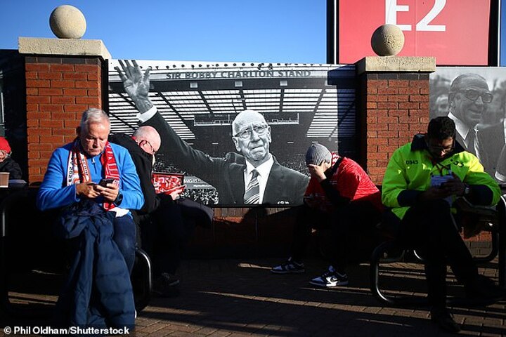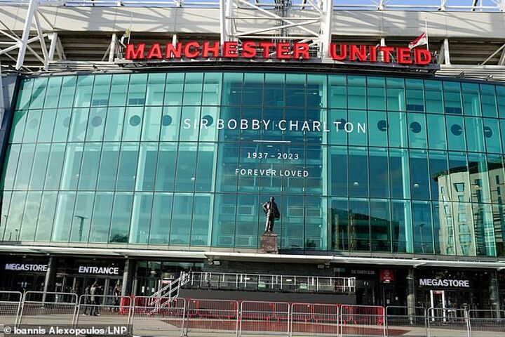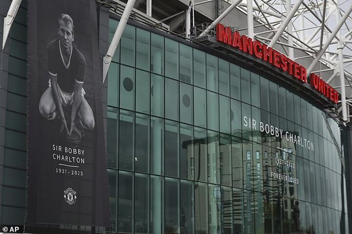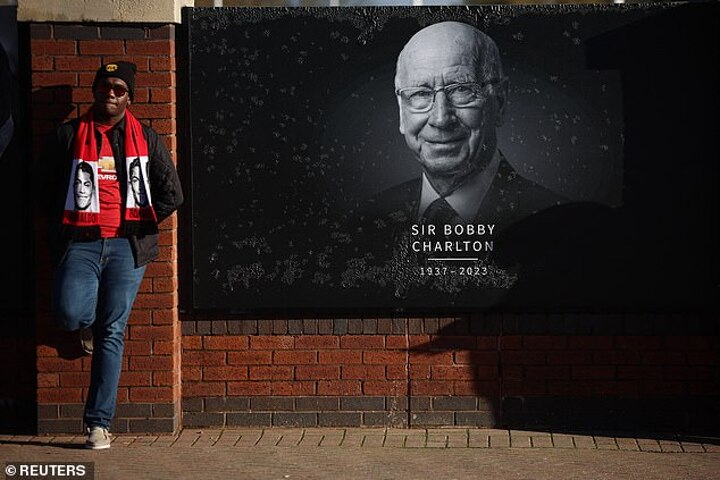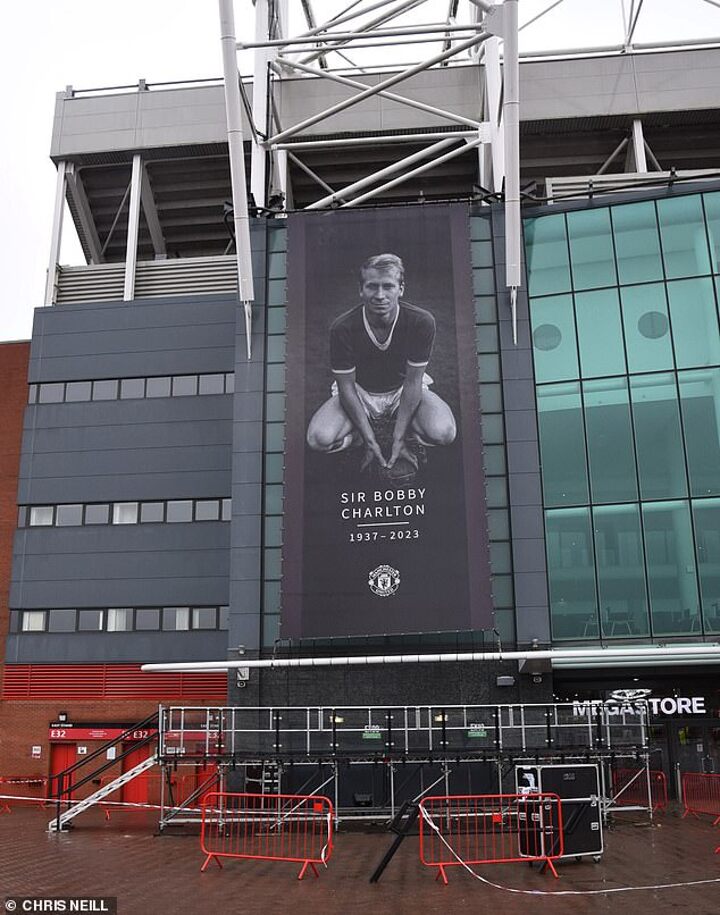 An enormous poster depicting Charlton, who died on October 21 aged 86, in United colours was draped from the stadium's exterior, while a message emblazoned across the stadium, said: 'Sir Bobby Charlton, 1937 - 2023. Forever loved.'