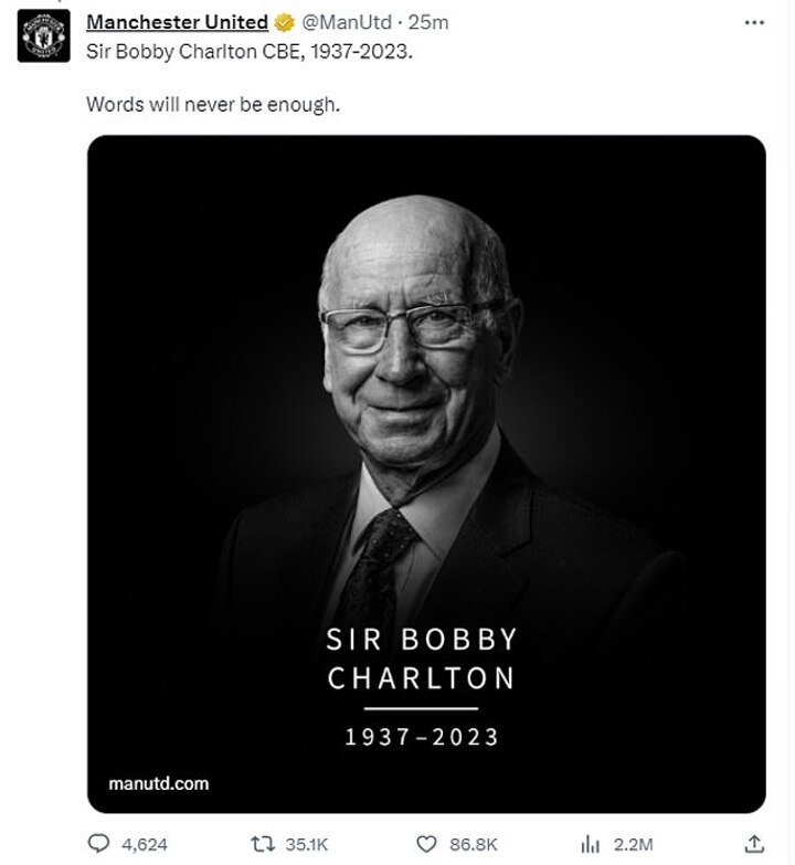 Manchester United said 'words will never be enough' as they mourn 'one of the greatest and most beloved players in the history of our club', while England described Charlton, who had previously held the record as all-time top goalscorer for both England and United, as a 'true legend of our game'.