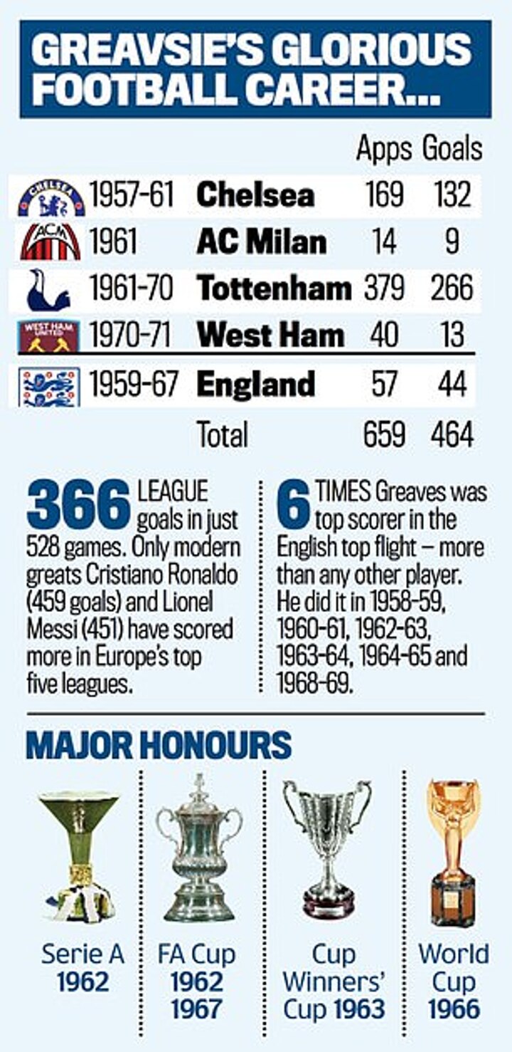 Greaves’s achievements are mightily impressive, too. No one has scored more goals in the top flight of English football than his 357 for Chelsea, Tottenham and West Ham.