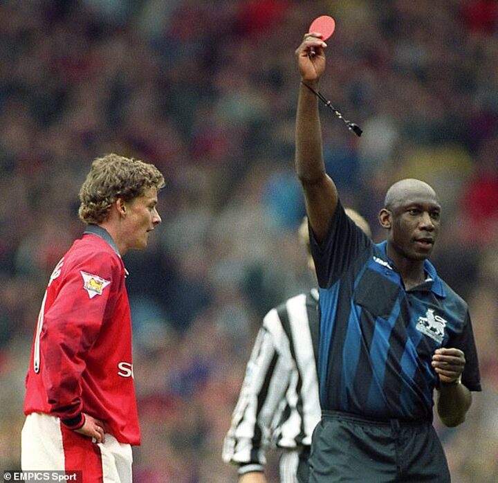 Solskjaer is a United legend following his playing days after helping them win the treble in 1999 but his time at Old Trafford is also remembered for the only red card he picked up at the club early on his career.