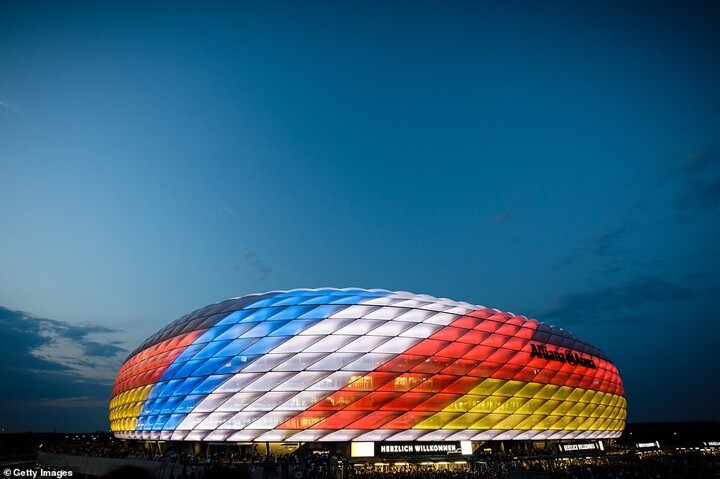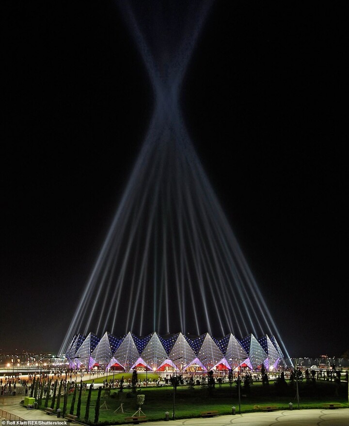 Over 300,000 LED lights over a surface area of 26,000 square metres are capable of producing some 16million different colour combinations behind the diamond-shaped panels that form the stadium’s membrane shell.