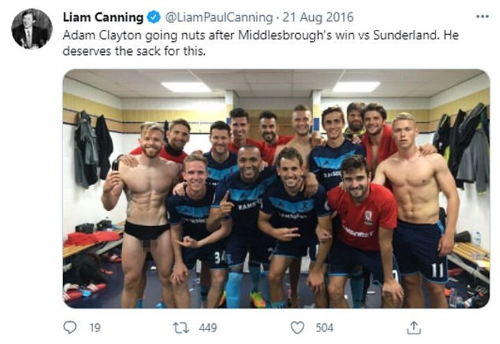 Midfielder Adam Clayton, who was changing back into his regular clothes, posed for the photo - but one of his testicles was poking out of his shorts.