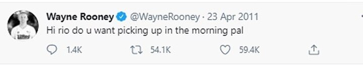 Seemingly unaware of how Twitter worked at the time, Rooney's first ever tweet in 2011 read: 'Hi rio do u want picking up in the morning pal' and several football fans piled in on the conversation on social media.