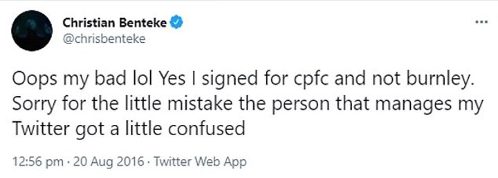 A tweet from the striker read: 'Oops my bad lol Yes I signed for cpfc and not burnley. Sorry for the little mistake the person that manages my Twitter got a little confused'