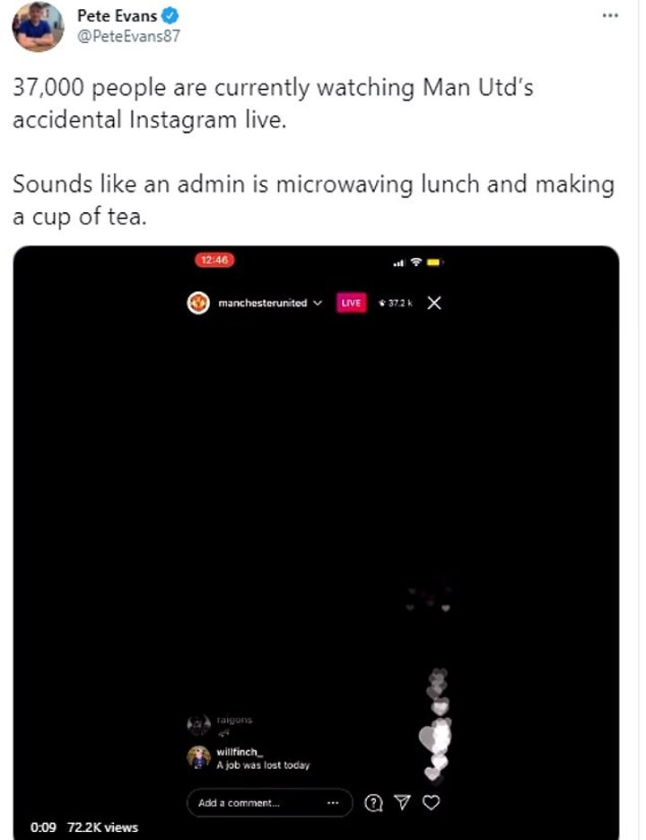 A Red Devils employee accidentally set the club's 'Instagram Live' feature on last Wednesday and more than 37,000 fans tuned in to watch a black screen and hear noises of the employee appearing to hear the knocking of plates together and the sound of a microwave.