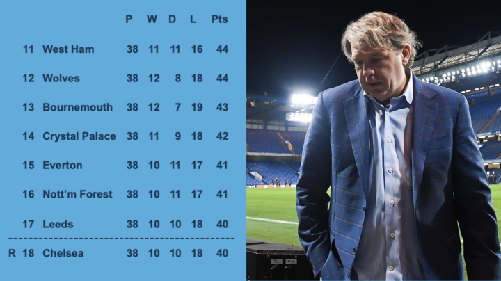 A bore 0-0 draw against Brentford is met by a chorus of boos at Stamford Bridge and another dressing down by Todd Boehly, who goes around each player in turn, points at them and simply says “embarrassing”. No goals for and 24 against heading into the final day, Chelsea no longer have a goal difference advantage, but need just a draw to be sure of their Premier League survival.