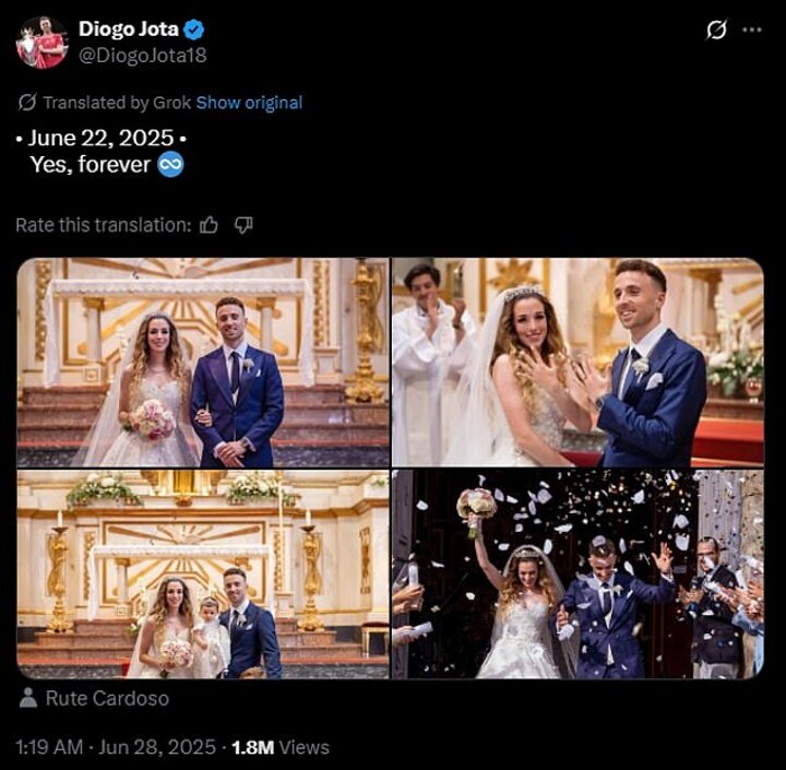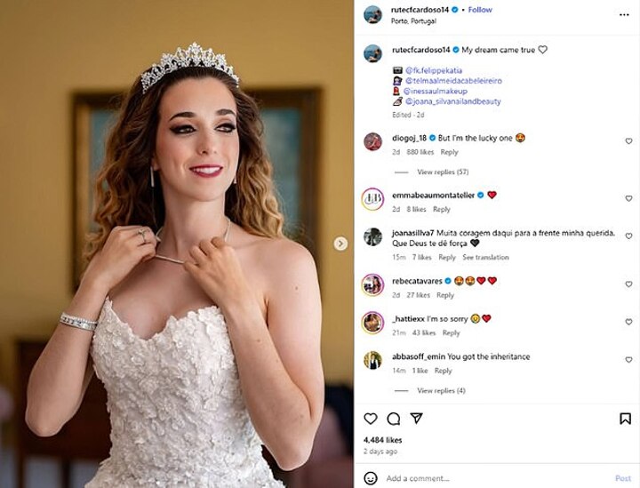 Two days ago, Jota left Cardoso a comment on Instagram after his wife wrote 'my dream came true' following their wedding.