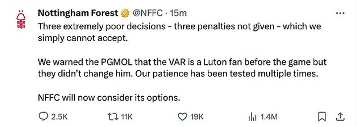 ‘Three extremely poor decisions — three penalties not given — which we simply cannot accept. We warned the PGMOL that the VAR is a Luton fan before the game but they didn’t change him. Our patience has been tested multiple times. NFFC will now consider its options.’