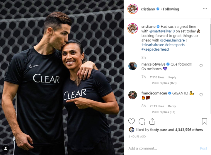 Cristiano Ronaldo recently worked together with Brazilian women football legend Marta Vieira da Silva on a commercial, the Portugal ace felt very happy about this experience.