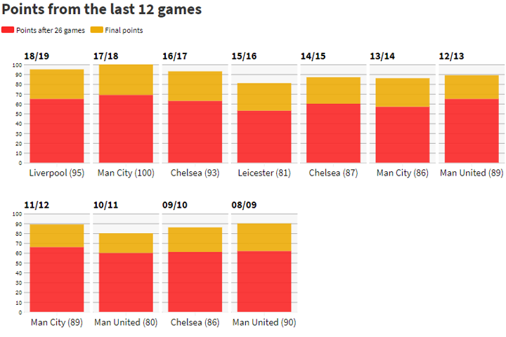 If they manage to achieve that total it will eclipse the finishes of every Premier League champion over the last decade apart from City last year who managed to hit triple figures with 100.