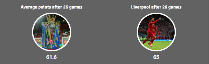 The points Klopp's men had accumulated in the first 26 games of the season is a higher total than all but two teams at this stage of the season - City last year manage to amass 69 and again in 2011/12 where they achieved 66.