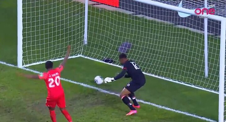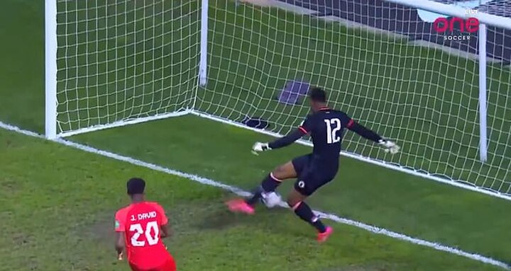 In a moment of panic, the Canada-born goalkeeper tries to thump the ball away from impending danger but his standing foot makes contact with the ball first before his intended kick clumsily just slices the ball across the line and into his own net.