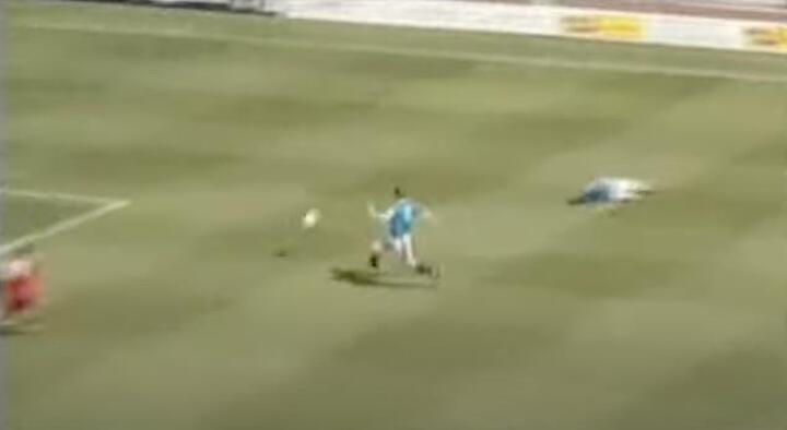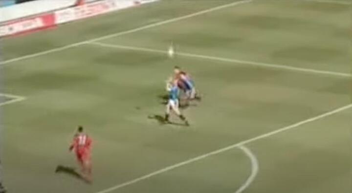 Having intercepted a cross from the right-hand side, Pollock, like Gascoigne, flicks the ball over one of his team-mate's and opponent's head while making his way into the box.