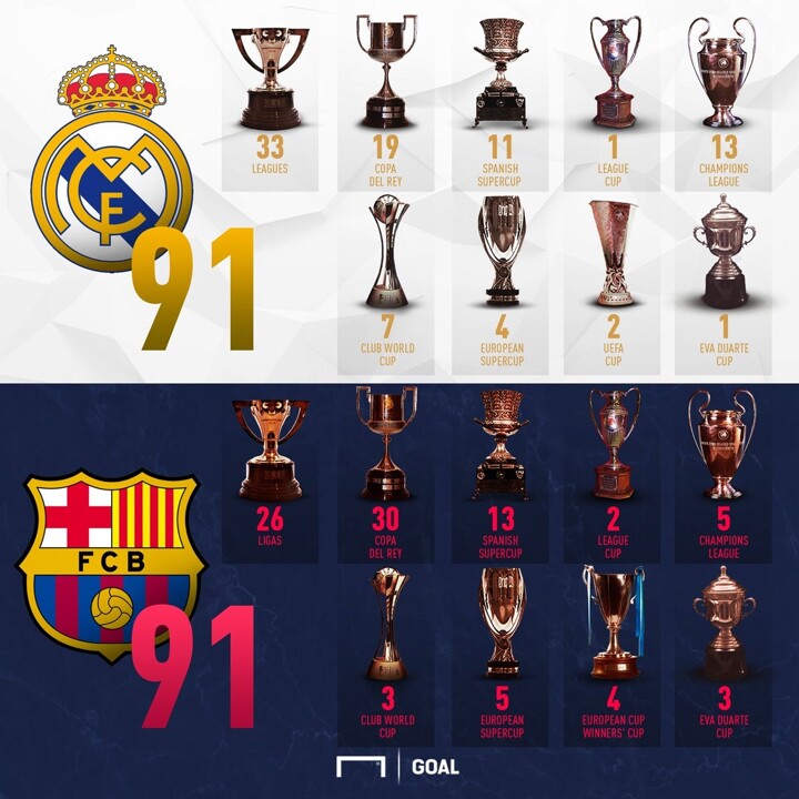After Real Madrid add Spanish Super Cup to their trophy cabin, both Spanish giants have claimed 91 trophies in history.