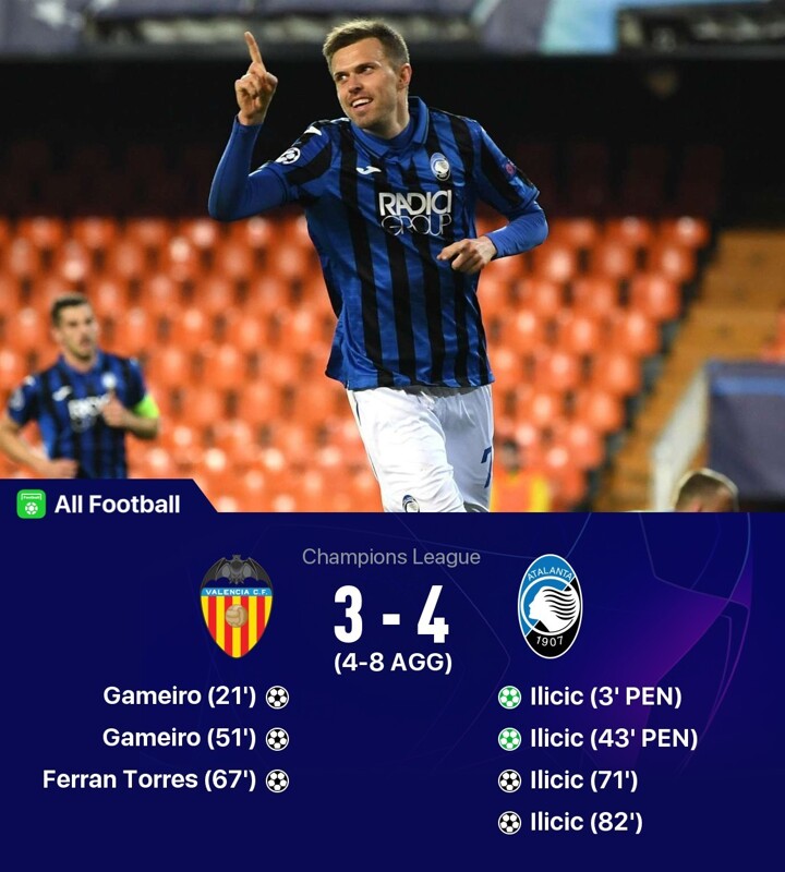 Josip Ilicic produced a sublime individual display as his four-goal haul led Atalanta to a 4-3 win away to Valencia, securing an 8-4 aggregate triumph and a first Champions League quarter-final.