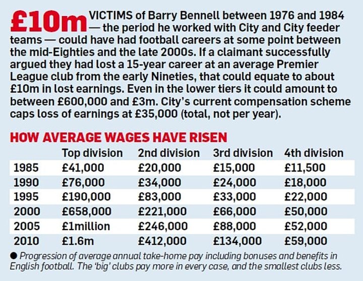 But the Mail on Sunday is aware of disquiet from a number of abused former players over a £35,000 cap imposed by City for loss of earnings suffered by those whose fledgling careers were destroyed by repeated sexual abuse by Bennell and Broome.