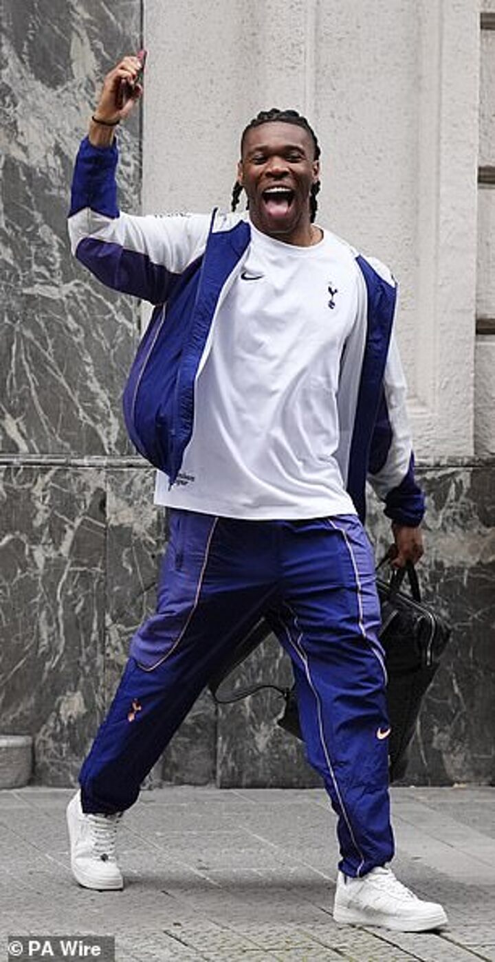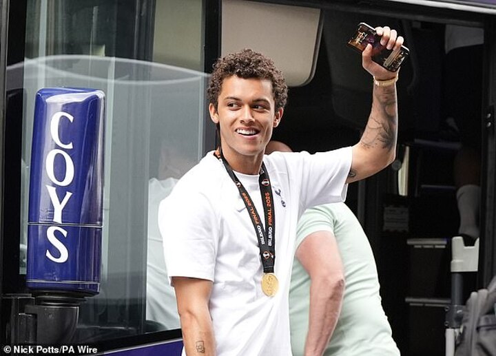 The pose was replicated by James Maddison, Pedro Porro and Destiny Udogie as they greeted supporters.