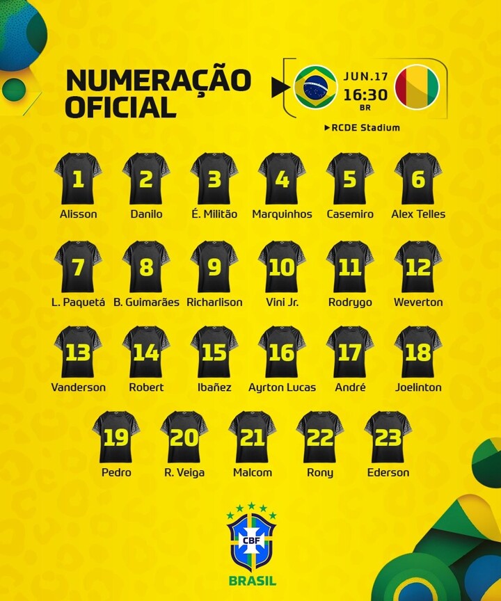 The Brazil national football team has announced their squad list and shirt numbers for friendly against Guinea.
