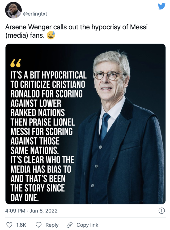 “It’s hypocritical to criticize Cristiano Ronaldo for scoring against lower ranked nations then praise Messi for scoring against those same nations. It’s clear who the media has bias to and that’s been the story since day one.”