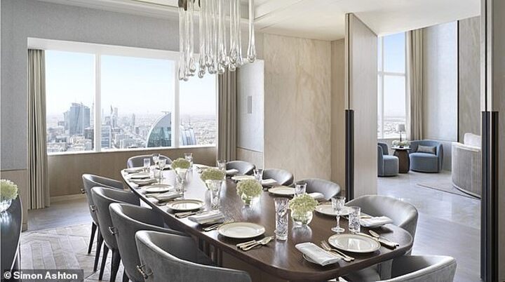 The hotel says the suite offers panoramic views of Riyadh 'and its surroundings lend a unique sense of exclusivity to this versatile suite, which features an elegant dining room, pantry, living room and executive study.'